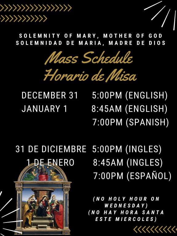 Daily Mass is celebrated at 8:45 am Tuesday-Friday in English and Thursday at 6 pm in Spanish. Communion Service is held on Mondays at 8:45am.