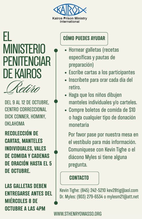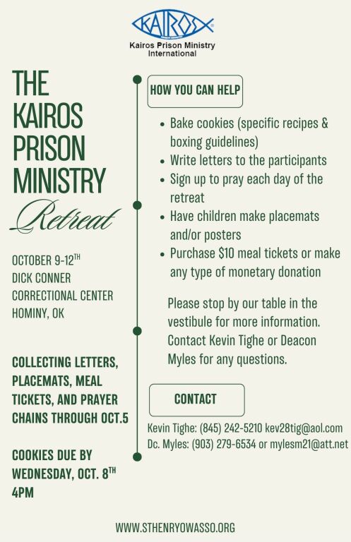 **THE KAIROS MINISTRY TEAM WILL BE IN THE VESTIBULE ON THE WEEKENDS OF SEPTEMBER 27 & 28 AND OCTOBER 4 & 5. PLEASE STOP BY AND SEE HOW YOU CAN HELP THIS WONDERFUL MINISTRY.