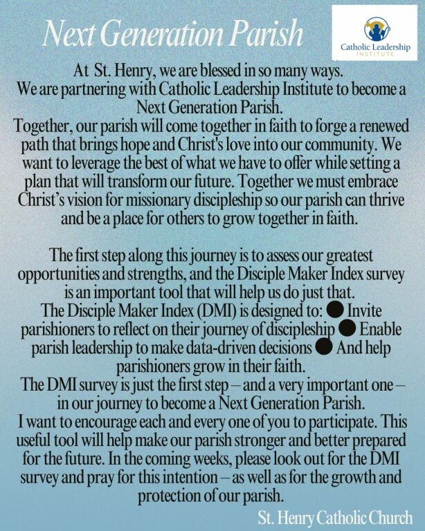 ST. HENRY is on a journey to know, love and serve Christ better and thrive! WE WANT TO HEAR FROM OUR PARISHIONERS! Complete the Disciple Maker Index (DMI) survey today. The survey assesses our unique strengths and opportunities. Share your perspective now to help strengthen St. Henry and better prepare us for the future!