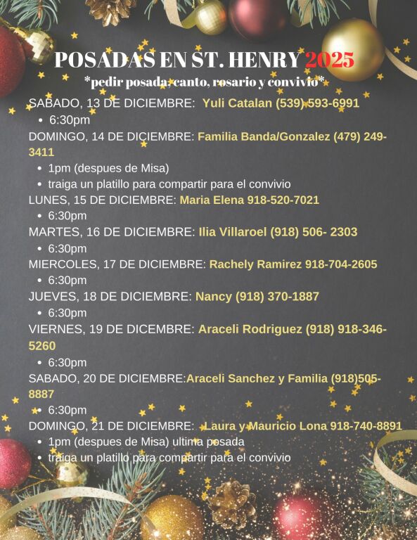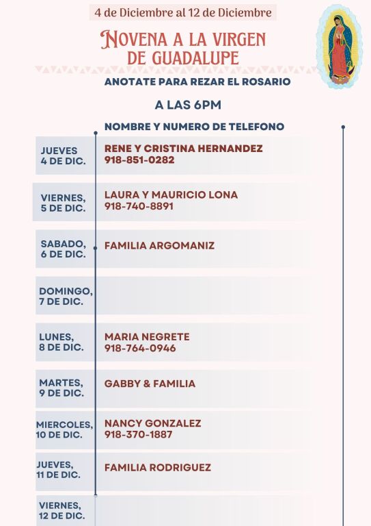La Misa es a las 6pm los Jueves y el Estudio de Fe es a las 6:30pm en el Salon St. Jude. Rezamos el rosario, hablamos sobre la fe y compartimos y aprendemos juntos. Unete a nosotros! Para mas informacion, llama a la oficina parroquial y pregunta por Laura o puedes comunicarte con Veronica Hernandez al (918) 808-0521.